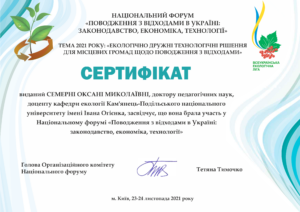 23-24 листопада 2021 року колектив кафедри екології прийняв участь у Національному форумі «Поводження з відходами в Україні: законодавство, економіка, технології», який відбувться у м. Київ ОНЛАЙН на платформі ZOOM. Тема доповіді «ТЕХНОЛОГІЇ ВИКОРИСТАННЯ ВІДХОДІВ І ЕКОЛОГІЧНА БЕЗПЕКА».
