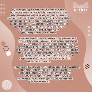 Згідно розпорядження на період з 22 березня до 16 квітня 2021 року здійснювати організацію освітнього процесу для здобувачів вищої освіти ступенів “бакалавр”, “магістр” денної форми навчання з використанням технологій дистанційного навчання.